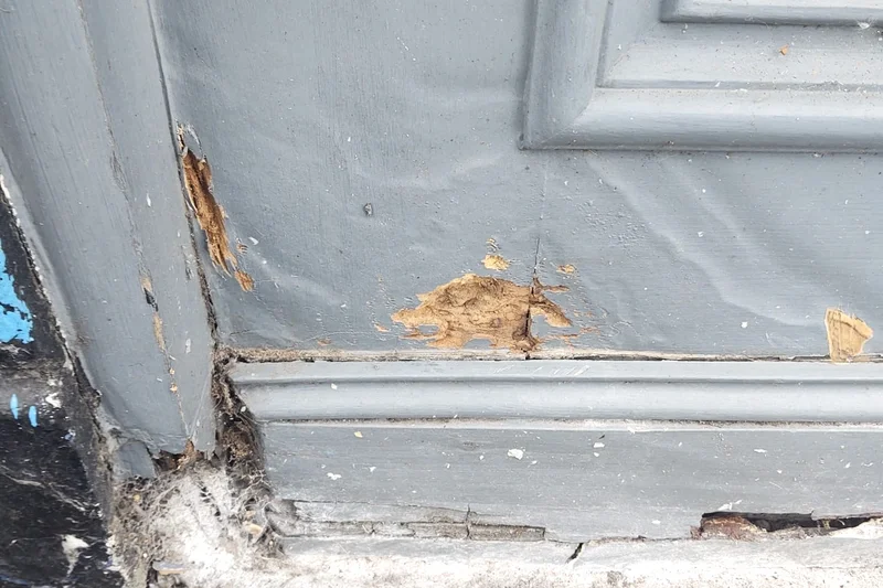 Bottom corner of a front door in Herne Bay — rot in the timber, paint lifting off.
